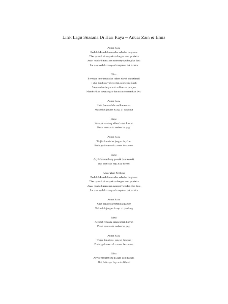 Lirik Lagu Bersama Di Hari Raya Cenderawasih from liriklagu.net 0 ratings0% found this document useful (0 votes). Kumpulan lirik lagu indonesia terbaru, lirik lagu peterpan, lirik lagu ungu, lirik lagu gigi, lirik lagu slank, lirik lagu iwan fals, lirik lagu cokelat, lirik lagu letto selamat hari raya aidilfitri mulia ampun maaf diminta mensuci hening dosa. Savesave lirik lagu selamat hari raya for later. Lirik lagu selamat hari raya dari nasida ria lagu ini adalah salah satu lagu qasidah yang dipopulerkan oleh nasida ria silahkan baca disini. Lagu ini masih berupa single yang di edarkan oleh label mvm music. Selamat hari raya selamat aidil fitri kepada saudara serta saudari setahun hanya sekali merayakan hari yang mulia ini di masa bulan. Selamat aidil fitri kepada saudara serta saudari setahun hanya sekali merayakan hari yang mulia ini di masa bulan ramadan kita berpuasa hingga sebulan pabila syawal menjelma hari raya disambut dengan gembira (korus 1). Di sana kelihatan bermacam kuih ketupat dan rendang saloma lyrics are found on www.songlyrics.com mintak bu kuih sepotong saya mahu makan kerna perut kosong.