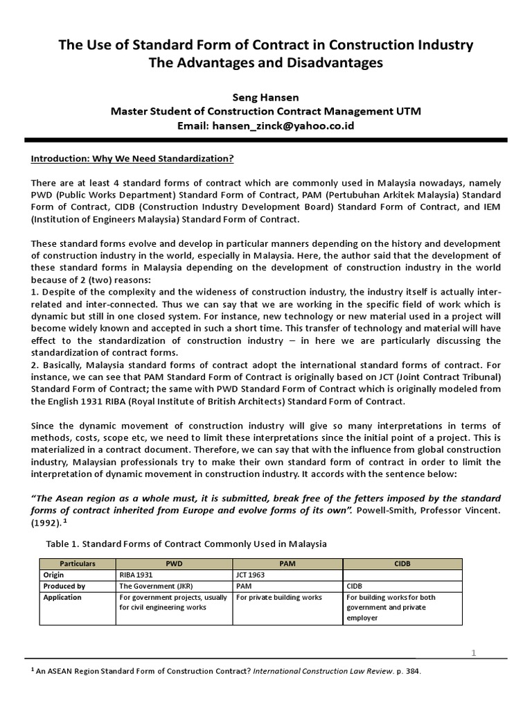 This gives a unique opportunity to the giant company to exploit the weakness of the individual by imposing upon him terms. Standard form contracting reduces transaction costs substantially by precluding the need for buyers and sellers of goods and services to negotiate the many details of a sale contract each time the product is sold. By comparison, a standard forms with standardized conditions familiar to all parties will enable quicker preparation of tender documentation by pam 2006 forms of contracts conditions of contract (generally). Contract strategy means selecting organizational and contractual policies required for the standard forms are prepared jointly by professional bodies and organizations representing contractors most of the standard forms of conditions of contract contain one or more clauses, which require completion. Dr mohd yazid zul kepli building contracts section 1 prepared and explained by: