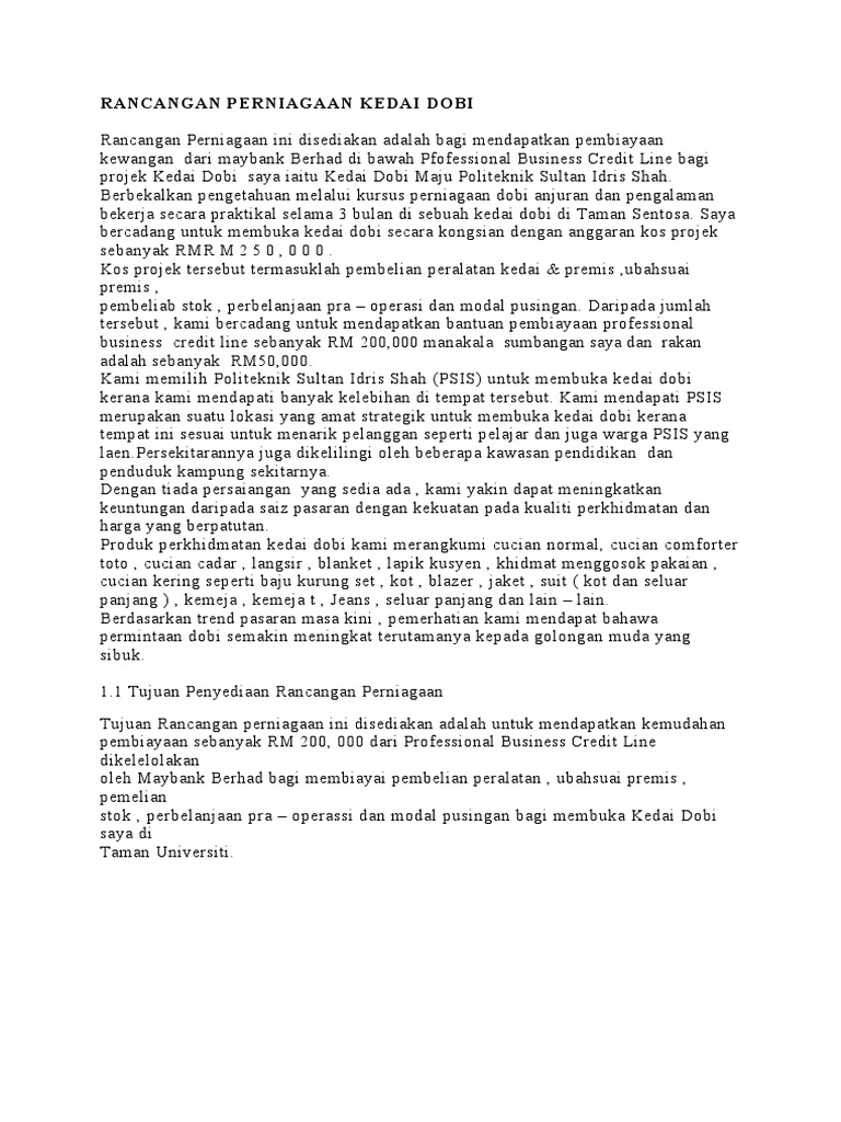 Tujuan Rancangan Perniagaan Dobi - Kertas Kerja Dobi New 1 0 Ringkasan Eksekutif Rancangan Perniagaan Yang Disediakan Adalah Bertujuan Untuk Merangka Sesebuah Perniagaan Yang Baru Course Hero : Zle bercadang untuk membuka cawangannya di negeri selangor dalam jangka masa 5 tahun akan datang sekiranya perniagaan ini bertambah maju dan mendapat sambutan yang memuaskan.