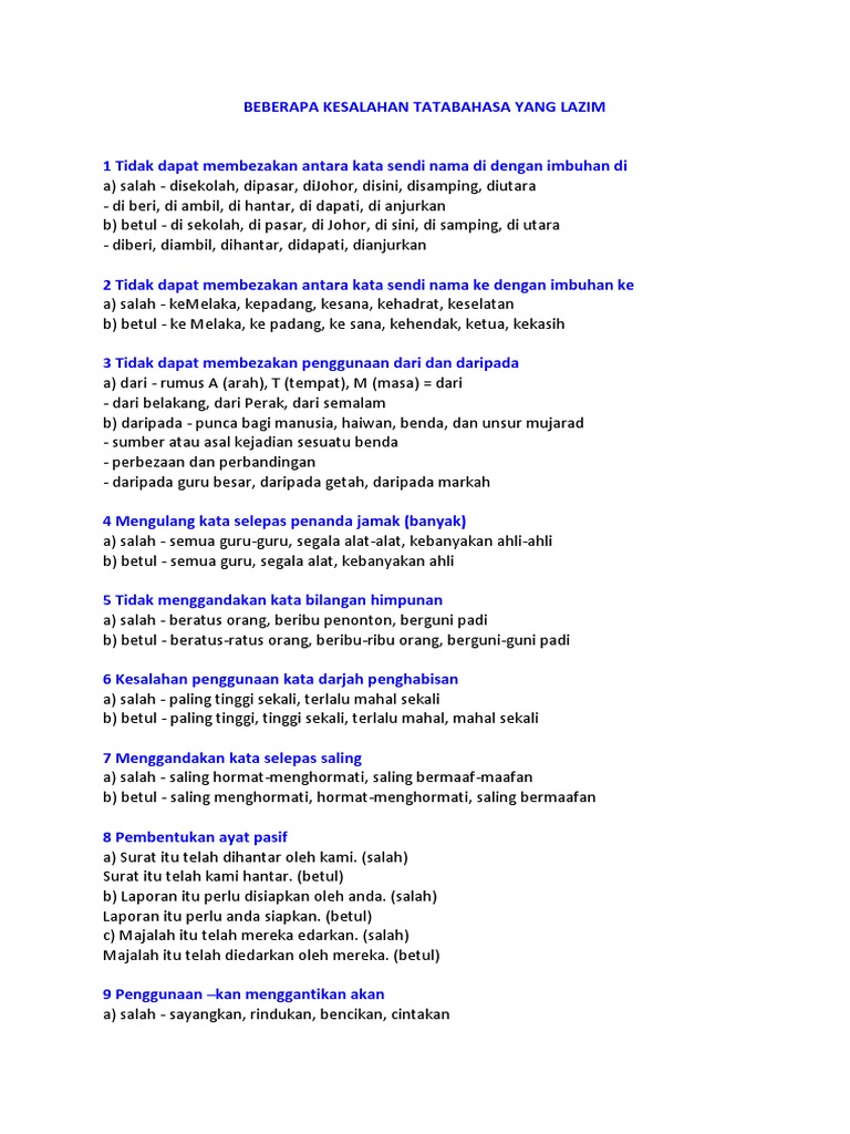 Dari masa itu, 18 tahun aku belajar adab sedangkan sisanya 2 tahun untuk. Penggunaan do, does, dan, did merupakan salah satu to be yang digunakan dalam kalimat bahasa inggris. Cikgu syahmie aiman berasal dari tumpat, sebuah lokasi yang terkenal dengan industri ikan arowana. Dari/daripada segi dan dari/daripada sudut pandang. Daripada hanya digunakan sebagai pembanding, contoh: Contoh penggunaan kata sendi nama daripada: Penyakit dbd tidak ditularkan secara langsung dari orang ke orang, tetapi ditularkan kepada manusia. Penggunaan seruan nama allah swt, menjauhi doa yang buruk sama. Dampak positif dan negatif penggunaan internet. Kalau kita berkaca kepada ulama dahulu sangat mengutamakan belajar adab seperti, imam ibnu qosim salah satu murid senior imam malik menyatakan aku telah mengabdi kepada imam malik bin anas selama 20 tahun. Ketika obat psikoaktif memasuki tubuh si pengguna, obat akan memberi pengaruh terhadap perilaku seseorang. Ia adalah sumber semula jadi vitamin dan penting untuk mikroorganisma organisma. Nah, daripada binggung, langsung saja berikut adalah contoh penggunaan kata di yang ditulis secara terpisah.